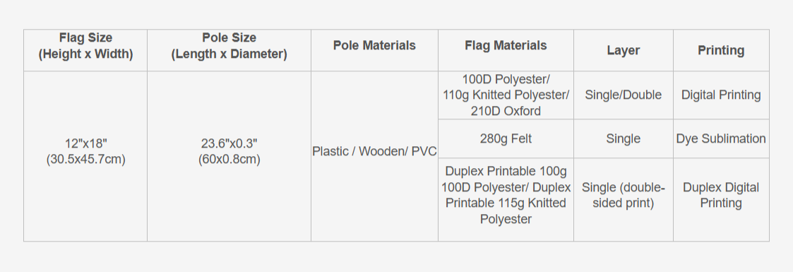 We offer these hand waver flags in standard sizes that include:4″x6″, 6″x9″, 8″x12″, 12″x18″, and 24″x36″. Different hardware options like a plastic pole, wooden pole, PVC pole are available for different sizes of the flags, you can choose according to your needs and budget.