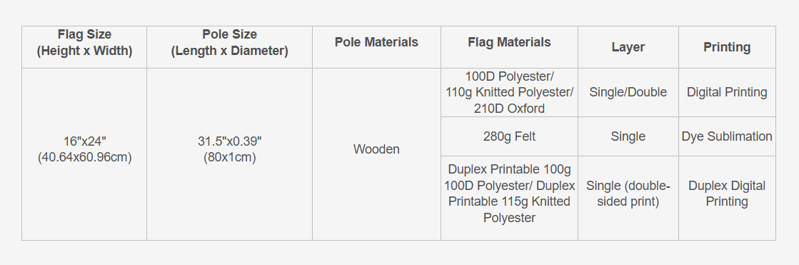We offer these hand waver flags in standard sizes that include:4″x6″, 6″x9″, 8″x12″, 12″x18″, and 24″x36″. Different hardware options like a plastic pole, wooden pole, PVC pole are available for different sizes of the flags, you can choose according to your needs and budget.
