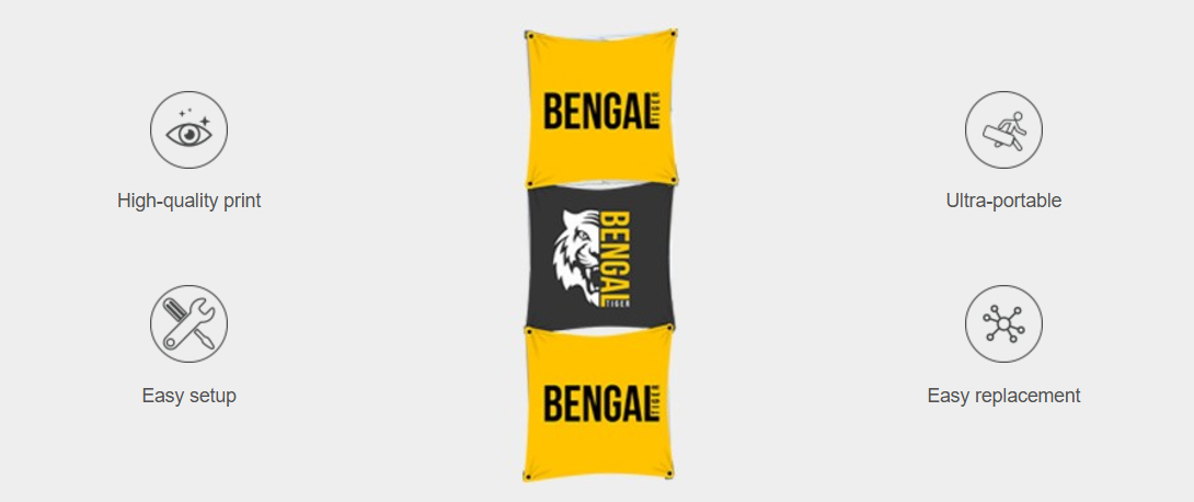 The installation is super easy and fast, just simply pop up the aluminum frame and attach the graphics for a no-fuss set-up. And each kit also includes a carrying bag for easy storage and transport.