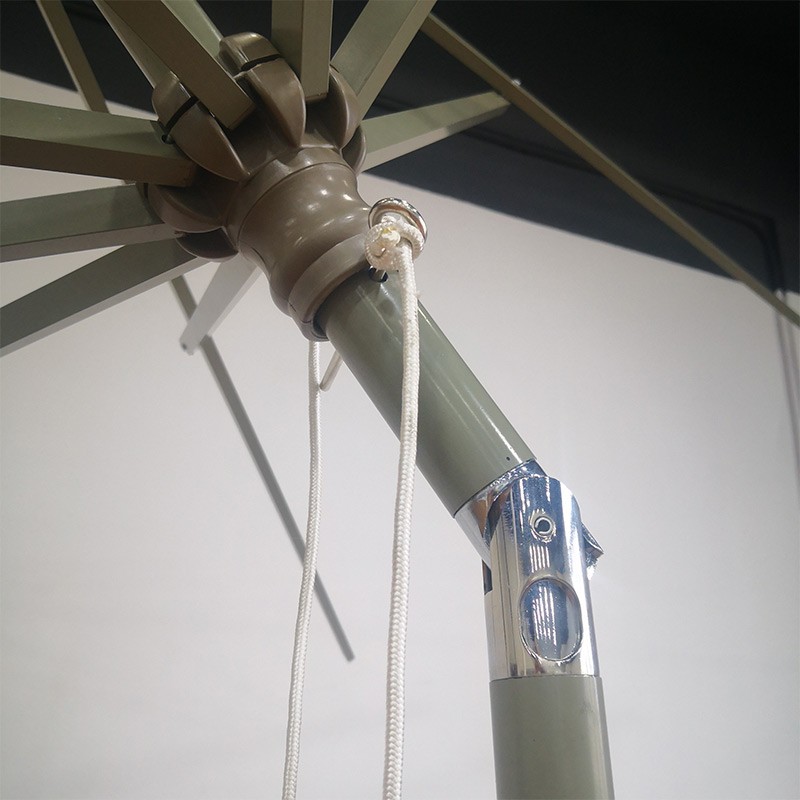 The canopy of this tilting patio umbrella is in an octagon shape and is constructed of water-proof, anti-UV, and flame retardant polyester. The solid aluminum frame makes the umbrella durable and not too heavy when moving. The umbrella can be easily opened and closed with a double pulley and rope lift mechanism. Besides, you can also freely adjust the tilt to find the perfect shade.