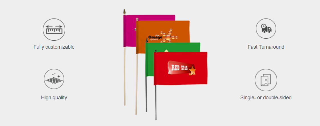 We offer these hand waver flags in standard sizes that include:4″x6″, 6″x9″, 8″x12″, 12″x18″, and 24″x36″. Different hardware options like a plastic pole, wooden pole, and PVC pole are available for different sizes of flags, you can choose according to your needs and budget.