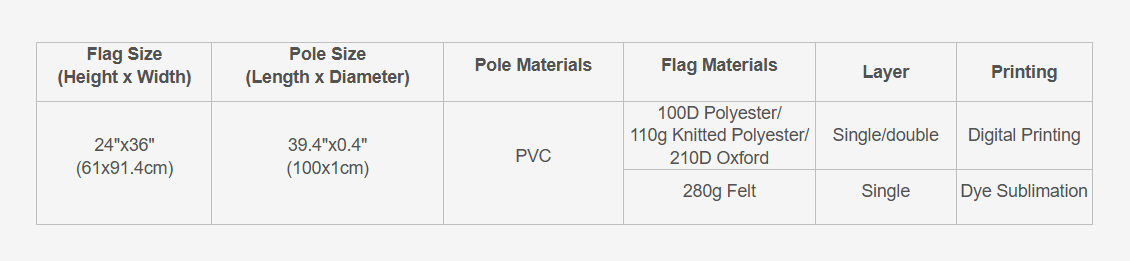 Single- or double-sided – we provide single- and double-sided print options for these flags. The 100D polyester and 110g Knitted Polyester are of great penetration, so your graphics are visible on the other side if you choose single-sided printed, but as a mirror image. If you mind that and hope your logo can be displayed well on both sides, you can choose the double-sided print.
