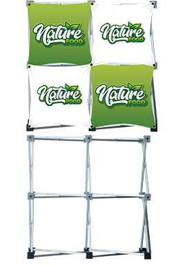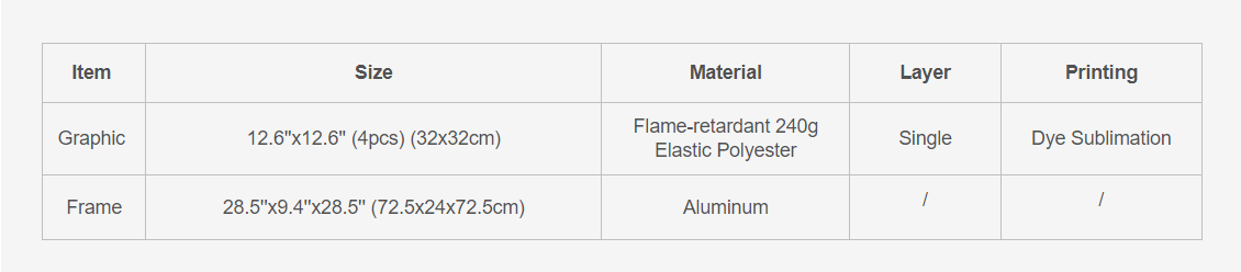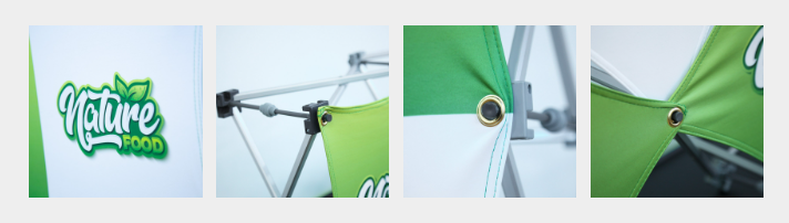 The graphics are made from 240g Elastic Polyester, the elasticity and durability of the fabrics make the replacement of panels easier. They can be easily attached to the frame with grommets at all four corners for a taut appearance.