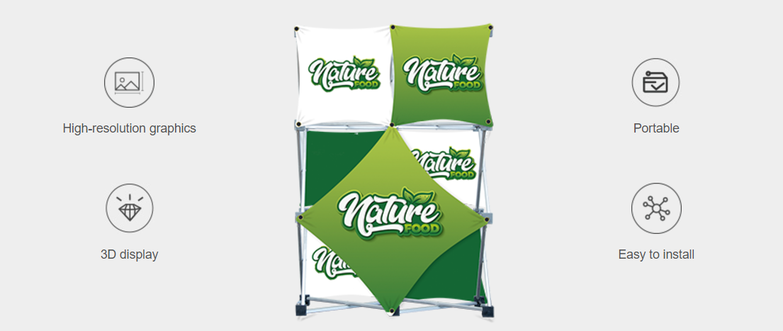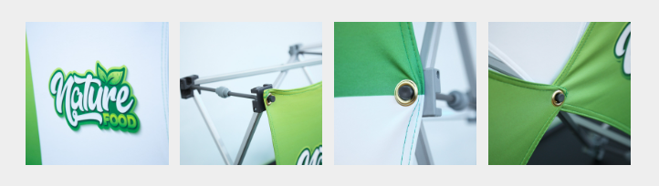The graphics are made from 240g Elastic Polyester, the elasticity and durability of the fabrics make the replacement of panels easier. They can be easily attached to the frame with grommets at all four corners for a taut appearance