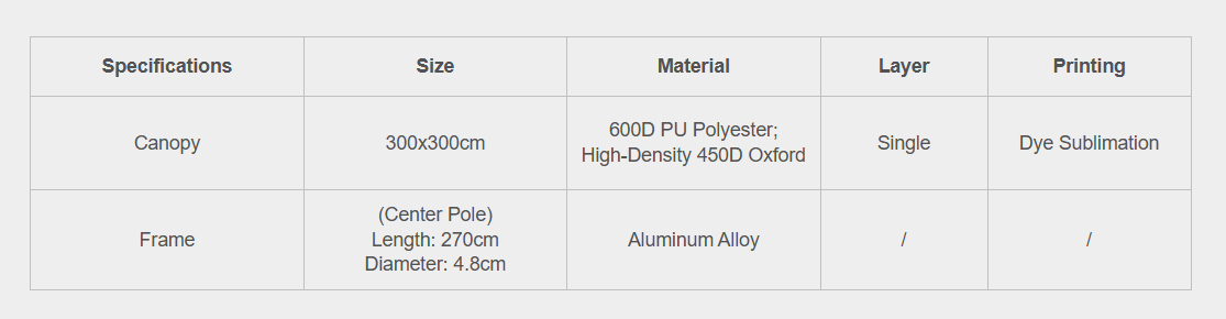 – a solid one-piece aluminum alloy frame which is composed of a 48mm center pole and 8 sturdy canopy ribs