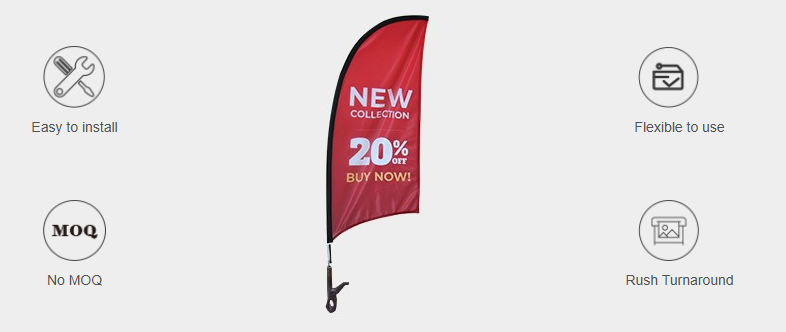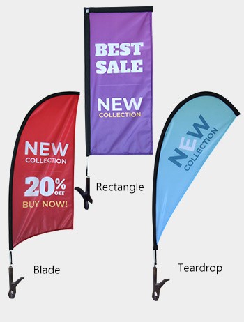 We offer clip flags in three shapes: teardrop, rectangle, and blade. We provide necessary hardware like poles and clips for these small custom flags. And the poles for rectangle flags are different from blade &teardrop. Each of our clip-on banner flags features a strong plastic clip that easily attaches to a pipe, fence, cable, rear-view mirror, hood, chair, etc. Teardrop and blade shape flags will use the same hardware, and rectangle flags will use different ones.