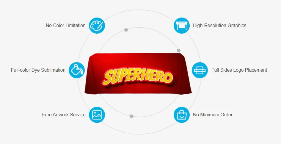 We have a range of fabric options for our table covers, depending on your needs and preferences. If you require a flame retardant fabric for indoor displays, we suggest our 300D flame retardant polyester or 600D PU polyester. If you are looking for a lightweight and affordable fabric, our 165g 300D polyester is a good choice. If you want to stand out at night, our fluorescent polyester table cover will make your display shine.