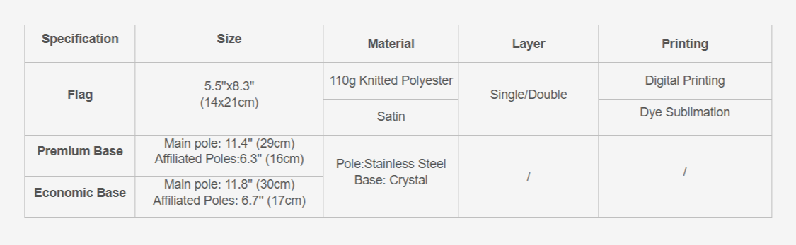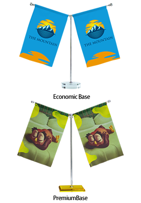 Each flag comes with a sturdy non-slip crystal base and stainless poles. We have premium base and economic base, the difference mainly lies in the shape and color of the base. The premium one is with a rectangle yellow crystal base, which would add a luxury touch to your desk. If you just want a simple desk flag, you can choose the round transparent crystal base (the economic one).