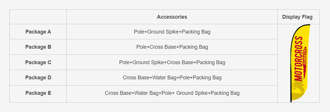 We provide 5 packages with different hardware and accessories. A cross base is perfect for any flat surface, it can be used with our water base to add extra support. And the ground spike can be used in grass or soil to add stability to your display flags. You can pick any one of them to install the custom feather flag with absolute balance and strength.