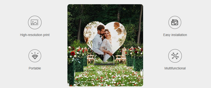 The frame is made of aluminum tubing with numbered push-pin poles, which allows you to set up and break down within minutes. The graphic backdrop is single or double-sided printed with full-color options, allowing you to create a vibrant and creative back wall for any event. And the graphic backdrop is replaceable. You can order replacement graphics from us easily. The chic heart-shaped arch frame can also be used multiple times and decorated to match any event at the time.