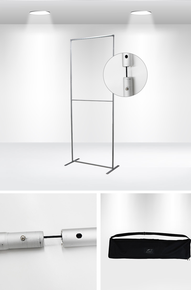This frame for our Standard Fabric Banner Stand (SKU: BDFBS-S) can be assembled quickly due to the easy locking components on the tubes. The snap-together pieces are also easy to disassemble and store in a compact size. The frame is very lightweight and will come with an oxford bag for easy carrying.