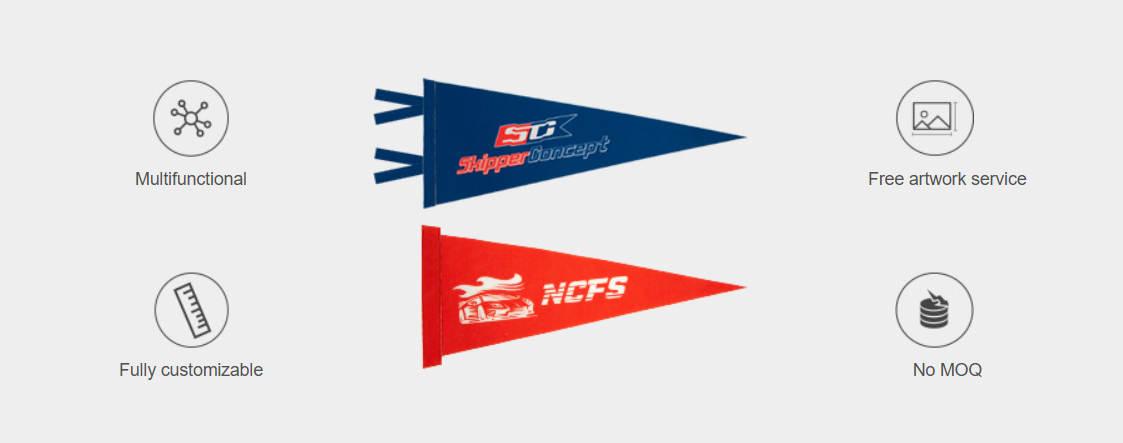 Free artwork service: Just need to upload your logo, the slogan, and the color you want for the pennants, our artwork person will create digital proof accordingly for you for free.