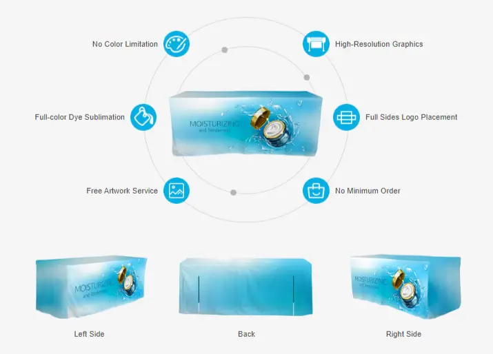 Customized fitted table covers back with slits are an amazingly easy and affordable way to bring a professional presence to trade shows, expos, festivals, job fairs, and conventions. As a branding product, our fitted table covers with slits to ensure you a full-color imprint. There is no limitation for your logo or image placement, and you can choose to print on the top or 3 sides of the table cover. Whether it is for brand exposure or an image showcase, this table cover can deliver your marketing messages vividly.