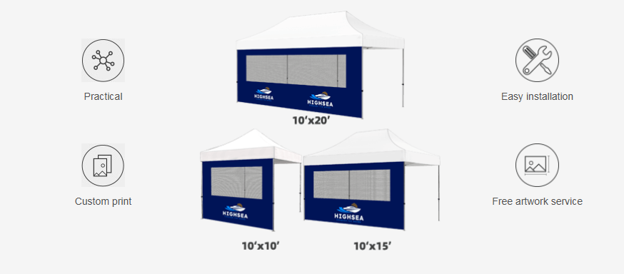 All our full walls come with Velcro on the top edge (both front and back sides), so you can easily attach them to your canopy tops. 2 windows that are made from transparent PVC film on the full wall can not only show clearly the interior of the tent but can also set up a protective screen between you and your clients. And you can also choose to add a zipper(s) on the wall to make it more user-friendly.