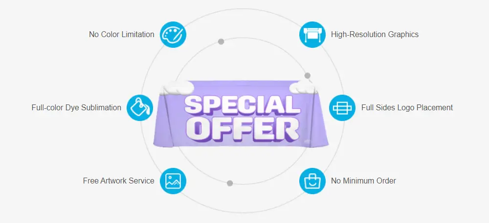 We offer a variety of fabric options for our table covers, depending on your preferences and requirements. If you need a flame retardant fabric for indoor displays, we recommend our 300D flame retardant polyester or 600D PU polyester. If you are looking for a lightweight and cost-effective fabric, our 165g 300D polyester is a great option. If you want to stand out at night, our fluorescent polyester table cover will make your display glow.