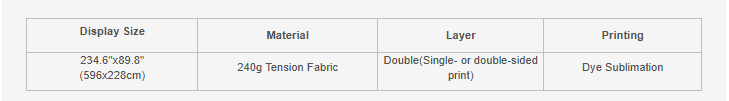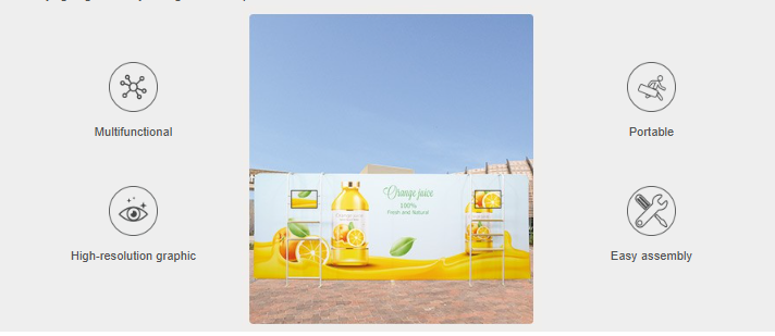 This backdrop kit includes a 20ft straight backdrop, a portable aluminum frame, 2 shelving racks, and a pillowcase fabric graphic. The shelving racks can be placed in a variety of positions along with the frame, as the top clips snap in place to fit the sloped edge as you adjust. Each rack consists of 3 shelves and a bracket that holds a 42 inches (or within 42inches) monitor for digital signage and promotion purposes. The shelves are sturdy enough that you can show a variety of products, giveaways, and literature without fear of tipping or breaking.