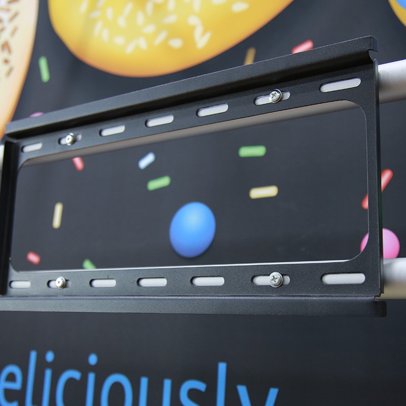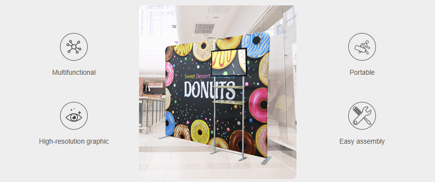 Compared to a traditional backdrop, this backdrop system combines digital signage and textile printing to offer a more complete and novel exhibit. It can freely stand in any place in your showroom, in a lobby, or open space. It is great for grabbing attention at exhibitions and events and can also be used for displays in showrooms and retail environments too.