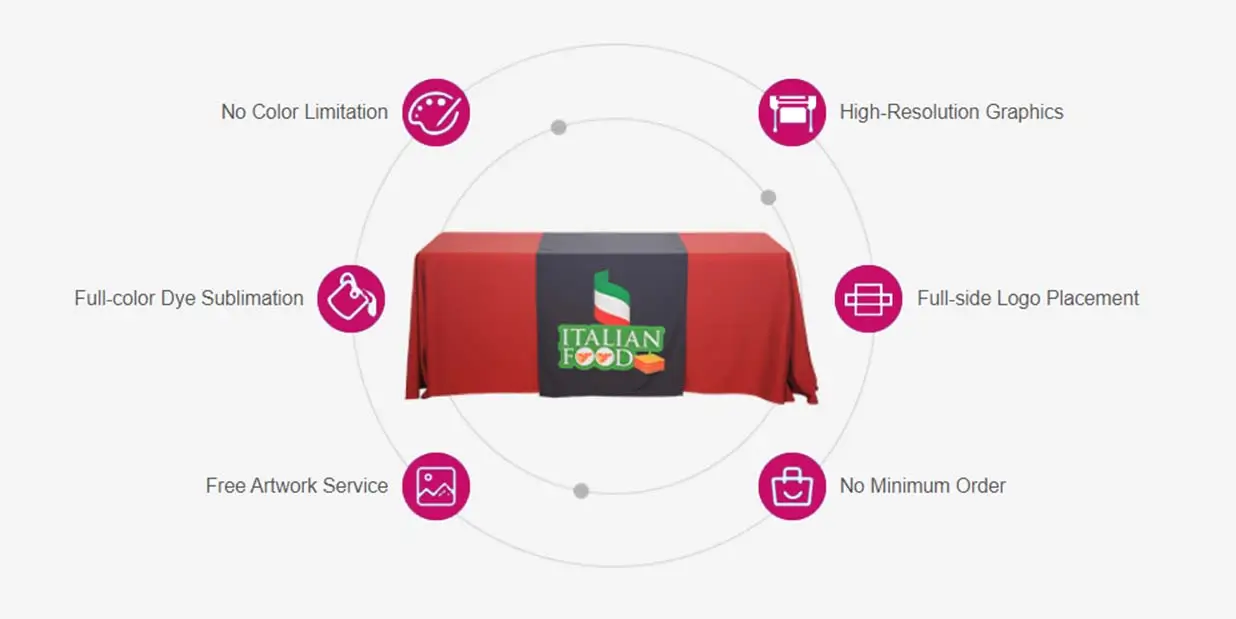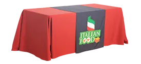 The reason that we need a custom printed table runner for our display table is obvious, that is, to promote the brand and leave a deep impression on potential audiences. A blank table cover with a custom printed table runner can be regarded as the most cost-effective display tool since the blank table cover can be used multiple times and the table runner is budget-saving. When printing your logo, brand, or messages on the table runner, your display table will be turned into an effective marketing tool immediately.