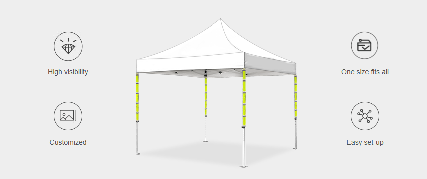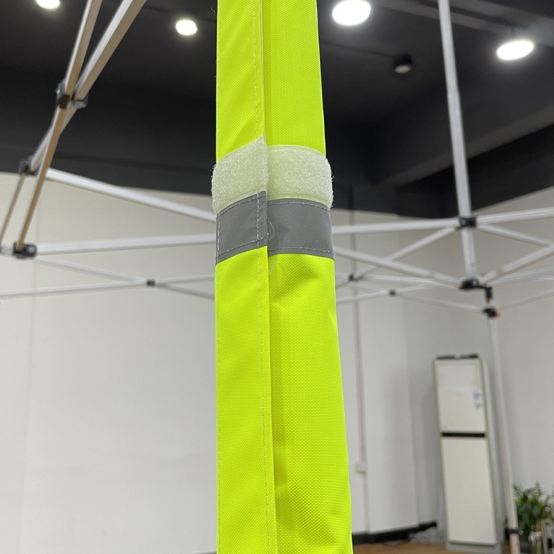 Each of these tent leg covers is sewn with reflective strips which offers a high visibility look. And we have 2 fabric options, normal 600D PU Polyester and 600D PU Polyester Fluorescent Yellow. For the former, you can print per your choice of any design, pattern or logo, or text to match your tent’s design. For the fluorescent fabric, only logos /designs with colors darker than the background color (Fluorescent Yellow) are recommended to ensure a great print effect.