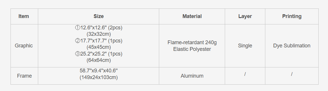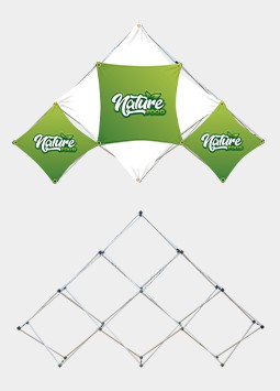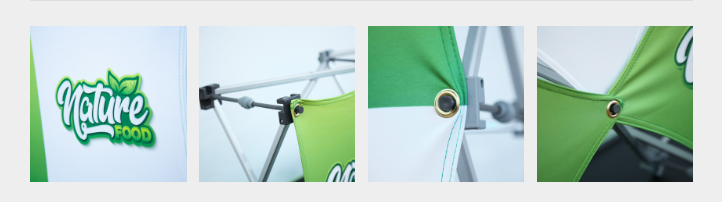 The graphics are made from 240g Elastic Polyester, the elasticity and durability of the fabrics make the replacement of panels easier. They can be easily attached to the frame with grommets at all four corners for a taut appearance.